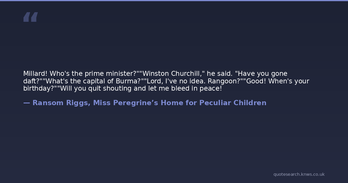 Millard! Who's the prime minister?""Winston Churchill," he said. "Have you gone daft?""What's the capital of Burma?""Lord, I've no idea. Rangoon?""Good! When's your birthday?""Will you quit shouting and let me bleed in peace!
