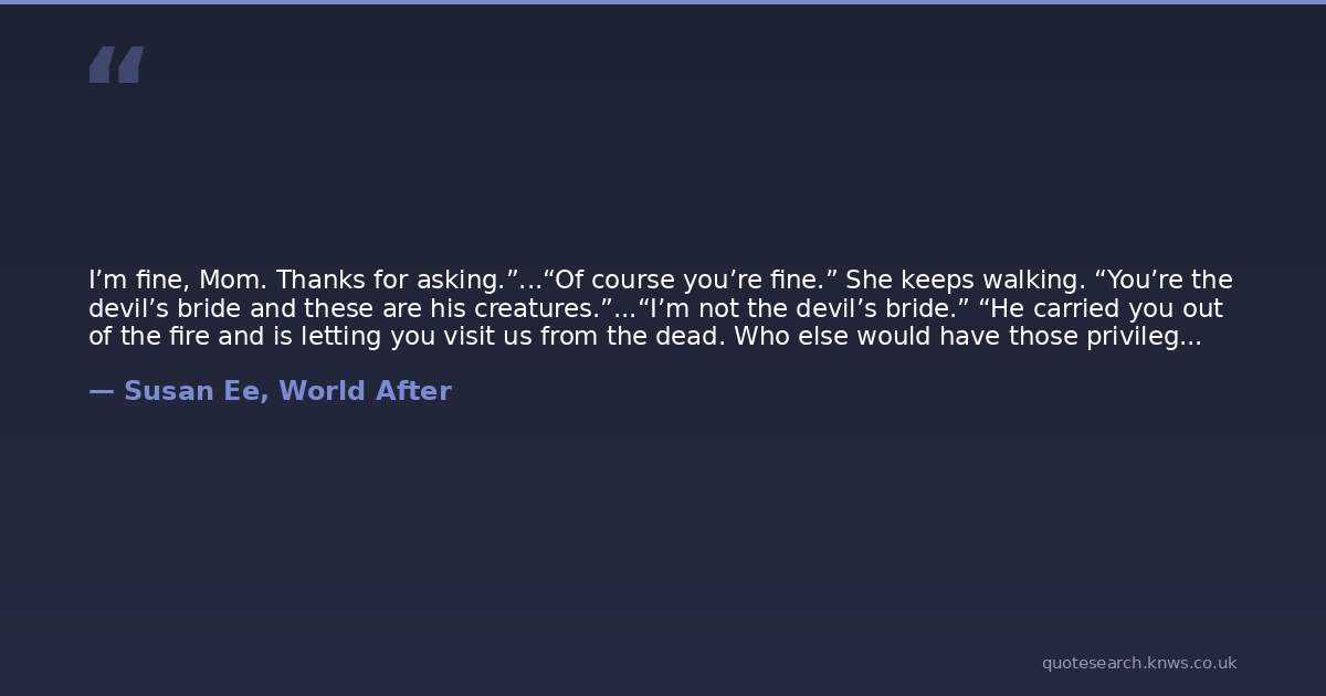 I’m fine, Mom. Thanks for asking.”...“Of course you’re fine.” She keeps walking. “You’re the devil’s bride and these are his creatures.”...“I’m not the devil’s bride.” “He carried you out of the fire and is letting you visit us from the dead. Who else would have those privileges except his bride?
