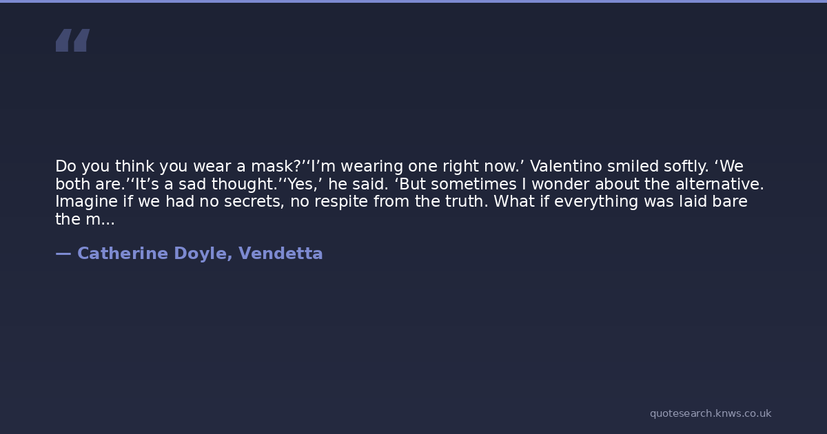 Do you think you wear a mask?’‘I’m wearing one right now.’ Valentino smiled softly. ‘We both are.’‘It’s a sad thought.’‘Yes,’ he said. ‘But sometimes I wonder about the alternative. Imagine if we had no secrets, no respite from the truth. What if everything was laid bare the moment we introduced ourselves?