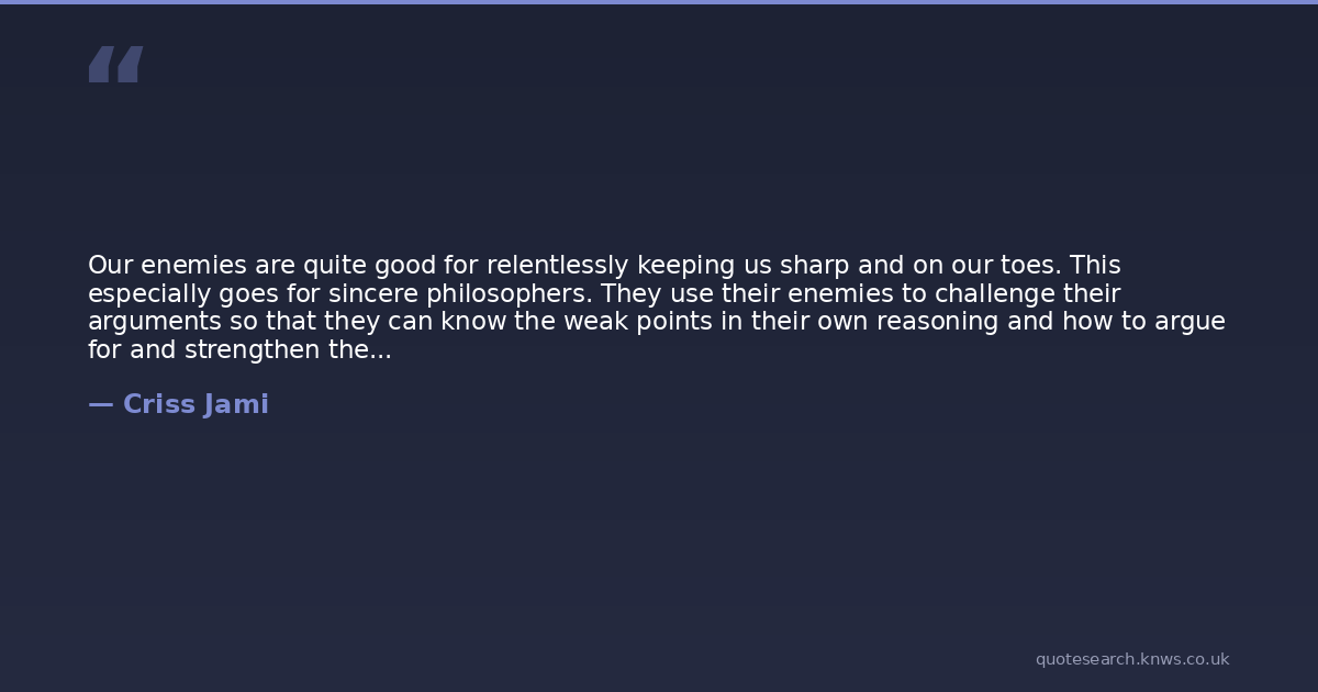 Our enemies are quite good for relentlessly keeping us sharp and on our toes. This especially goes for sincere philosophers. They use their enemies to challenge their arguments so that they can know the weak points in their own reasoning and how to argue for and strengthen their position. There are just none like one's enemies to always look for his mistakes and do it harder than anyone else.