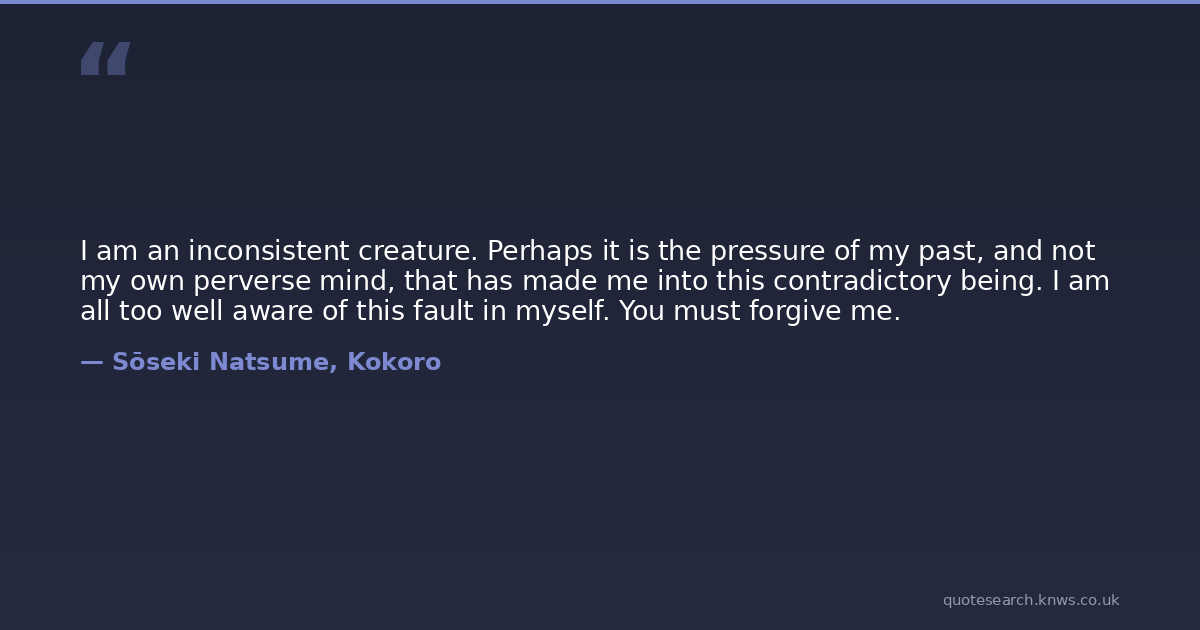 I am an inconsistent creature. Perhaps it is the pressure of my past, and not my own perverse mind, that has made me into this contradictory being. I am all too well aware of this fault in myself. You must forgive me.