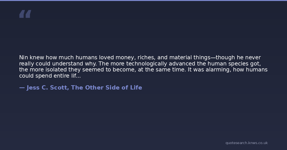 Nin knew how much humans loved money, riches, and material things—though he never really could understand why. The more technologically advanced the human species got, the more isolated they seemed to become, at the same time. It was alarming, how humans could spend entire lifetimes engaged in all kinds of activities, without getting any closer to knowing who they really were, inside.