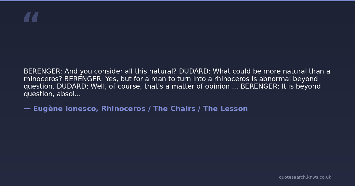 BERENGER: And you consider all this natural? DUDARD: What could be more natural than a rhinoceros? BERENGER: Yes, but for a man to turn into a rhinoceros is abnormal beyond question. DUDARD: Well, of course, that's a matter of opinion ... BERENGER: It is beyond question, absolutely beyond question! DUDARD: You seem very sure of yourself. Who can say where the normal stops and the abnormal begins? Can you personally define these conceptions of normality and abnormality? Nobody has solved this problem yet, either medically or philosophically. You ought to know that. BERENGER: The problem may not be resolved philosophically -- but in practice it's simple. They may prove there's no such thing as movement ... and then you start walking ... [he starts walking up and down the room] ... and you go on walking, and you say to yourself, like Galileo, 'E pur si muove' ... DUDARD: You're getting things all mixed up! Don't confuse the issue. In Galileo's case it was the opposite: theoretic and scientific thought proving itself superior to mass opinion and dogmatism. BERENGER: [quite lost] What does all that mean? Mass opinion, dogmatism -- they're just words! I may be mixing everything up in my head but you're losing yours. You don't know what's normal and what isn't any more. I couldn't care less about Galileo ... I don't give a damn about Galileo. DUDARD: You brought him up in the first place and raised the whole question, saying that practice always had the last word. Maybe it does, but only when it proceeds from theory! The history of thought and science proves that. BERENGER: [more and more furious] It doesn't prove anything of the sort! It's all gibberish, utter lunacy! DUDARD: There again we need to define exactly what we mean by lunacy ... BERENGER: Lunacy is lunacy and that's all there is to it! Everybody knows what lunacy is. And what about the rhinoceroses -- are they practice or are they theory?