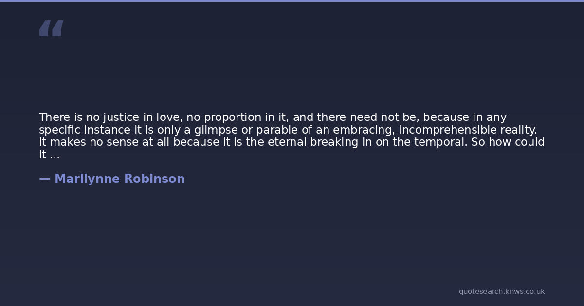 There is no justice in love, no proportion in it, and there need not be, because in any specific instance it is only a glimpse or parable of an embracing, incomprehensible reality. It makes no sense at all because it is the eternal breaking in on the temporal. So how could it subordinate itself to cause or consequence?