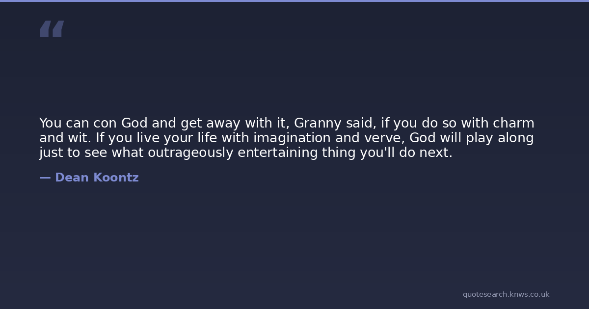 You can con God and get away with it, Granny said, if you do so with charm and wit. If you live your life with imagination and verve, God will play along just to see what outrageously entertaining thing you'll do next.