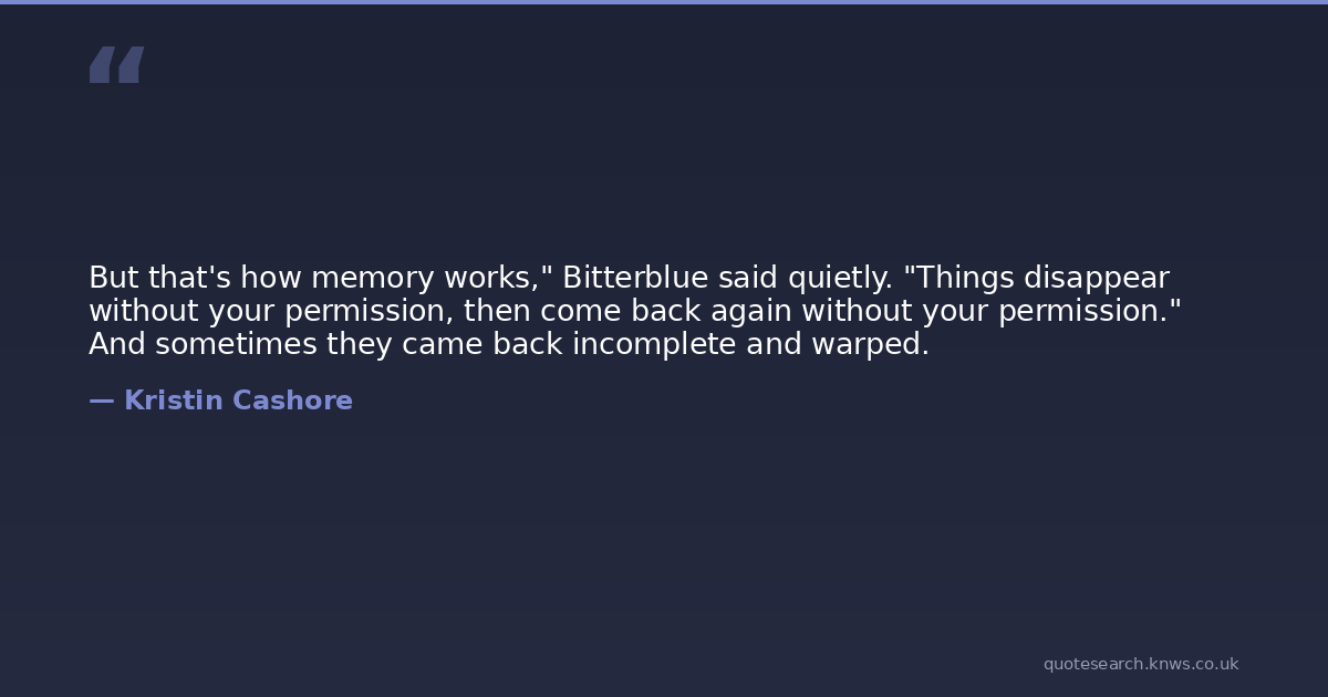 But that's how memory works," Bitterblue said quietly. "Things disappear without your permission, then come back again without your permission." And sometimes they came back incomplete and warped.