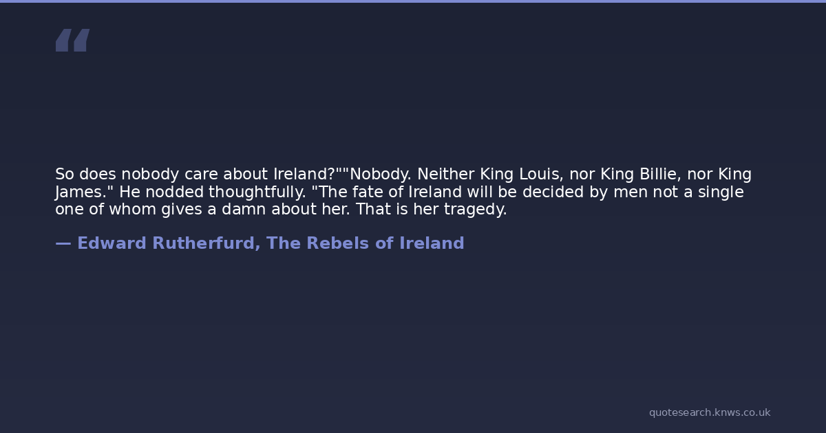 So does nobody care about Ireland?""Nobody. Neither King Louis, nor King Billie, nor King James." He nodded thoughtfully. "The fate of Ireland will be decided by men not a single one of whom gives a damn about her. That is her tragedy.
