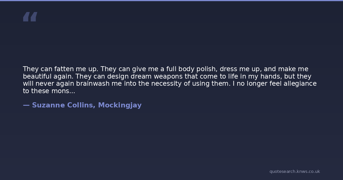 They can fatten me up. They can give me a full body polish, dress me up, and make me beautiful again. They can design dream weapons that come to life in my hands, but they will never again brainwash me into the necessity of using them. I no longer feel allegiance to these monsters called human beings, despite being one myself.