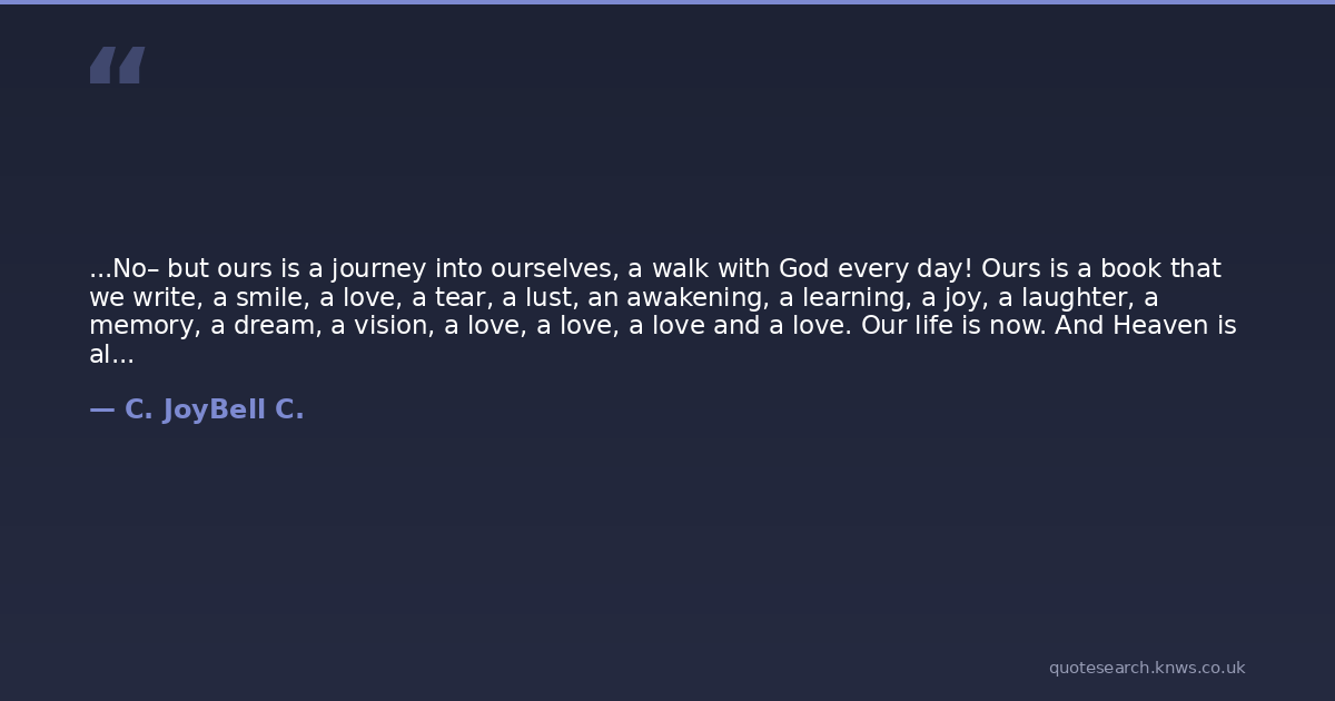 ...No– but ours is a journey into ourselves, a walk with God every day! Ours is a book that we write, a smile, a love, a tear, a lust, an awakening, a learning, a joy, a laughter, a memory, a dream, a vision, a love, a love, a love and a love. Our life is now. And Heaven is always there, but this life isn't always there, but this life isn't always here. Heaven is always there for us but this life is a gift to us!