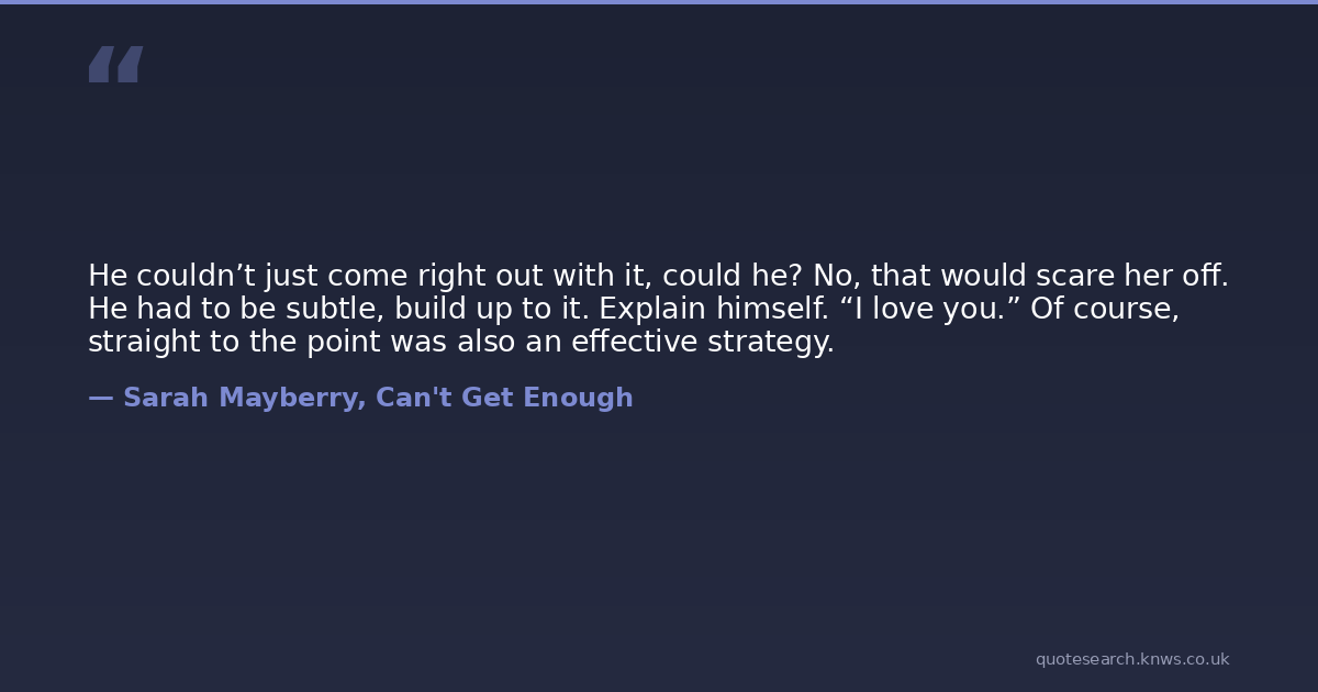 He couldn’t just come right out with it, could he? No, that would scare her off. He had to be subtle, build up to it. Explain himself. “I love you.” Of course, straight to the point was also an effective strategy.