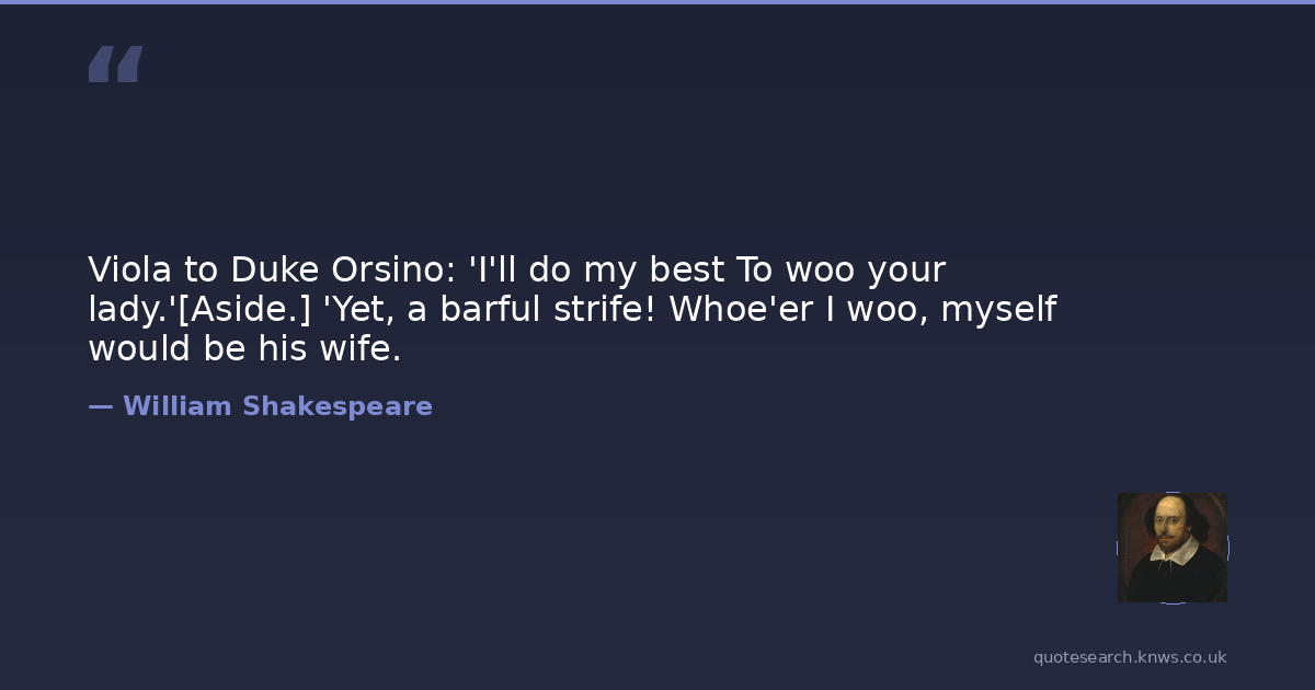 Viola to Duke Orsino: 'I'll do my best To woo your lady.'[Aside.] 'Yet, a barful strife! Whoe'er I woo, myself would be his wife.