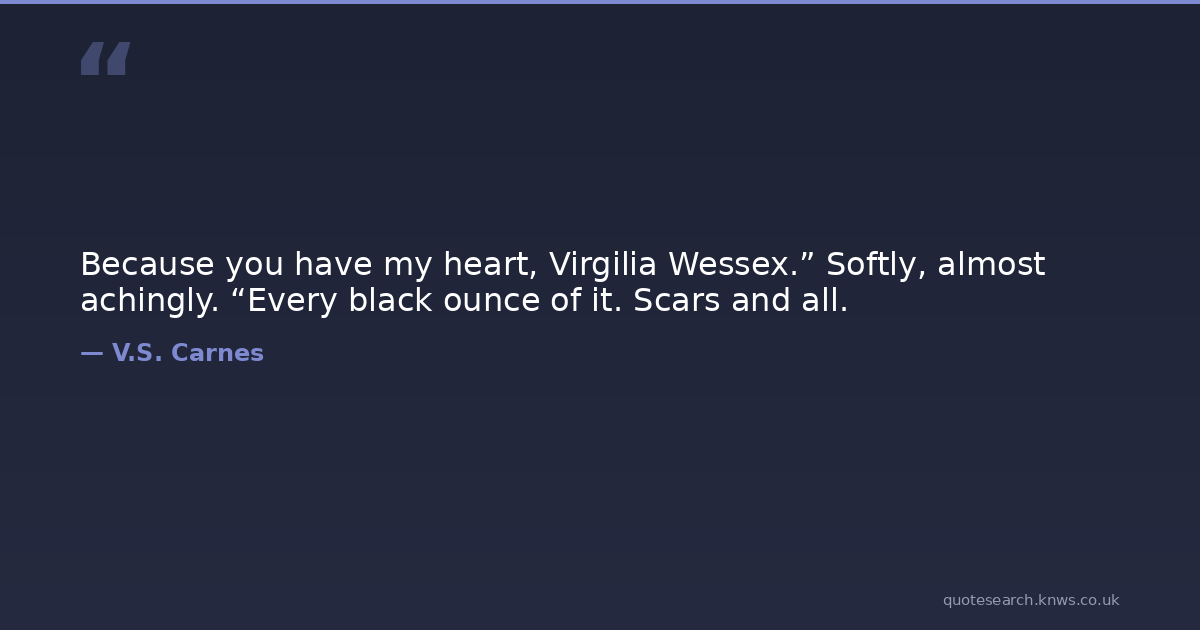 Because you have my heart, Virgilia Wessex.” Softly, almost achingly. “Every black ounce of it. Scars and all.