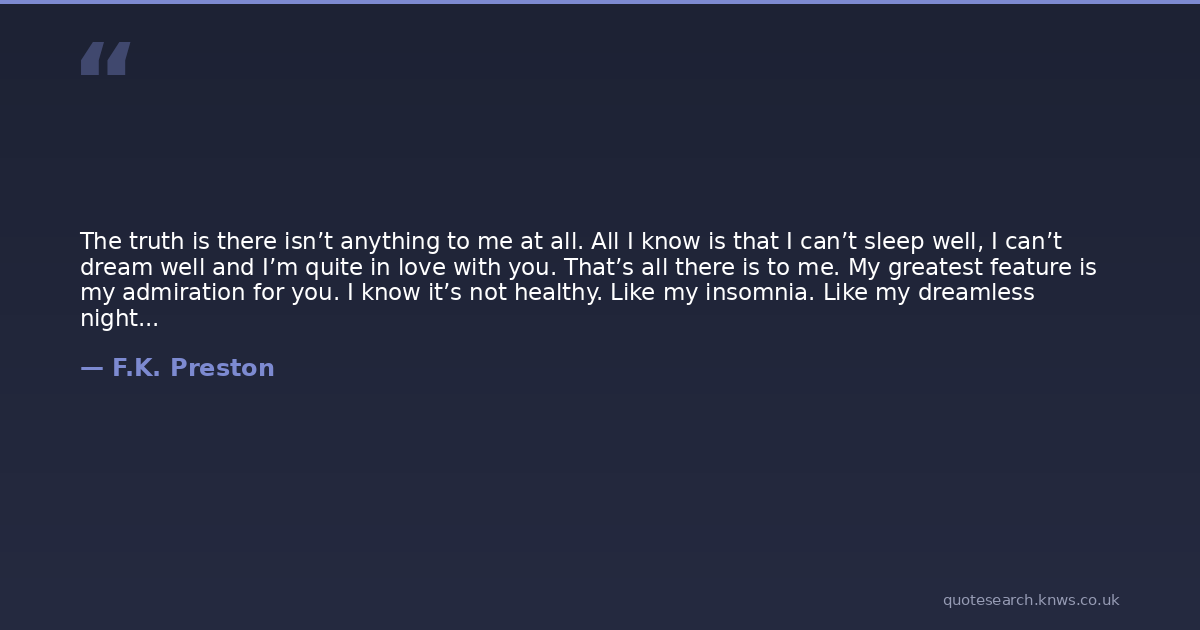 The truth is there isn’t anything to me at all. All I know is that I can’t sleep well, I can’t dream well and I’m quite in love with you. That’s all there is to me. My greatest feature is my admiration for you. I know it’s not healthy. Like my insomnia. Like my dreamless nights. You make living alright. My nightmares come when I think of a night without Valeria. That’s when I realise you’re dead. That’s when I remember you’ve been gone for years. That’s when I remember I’m awake. And I wait for this dream called Life to leave me to my peace once and for all and forever.