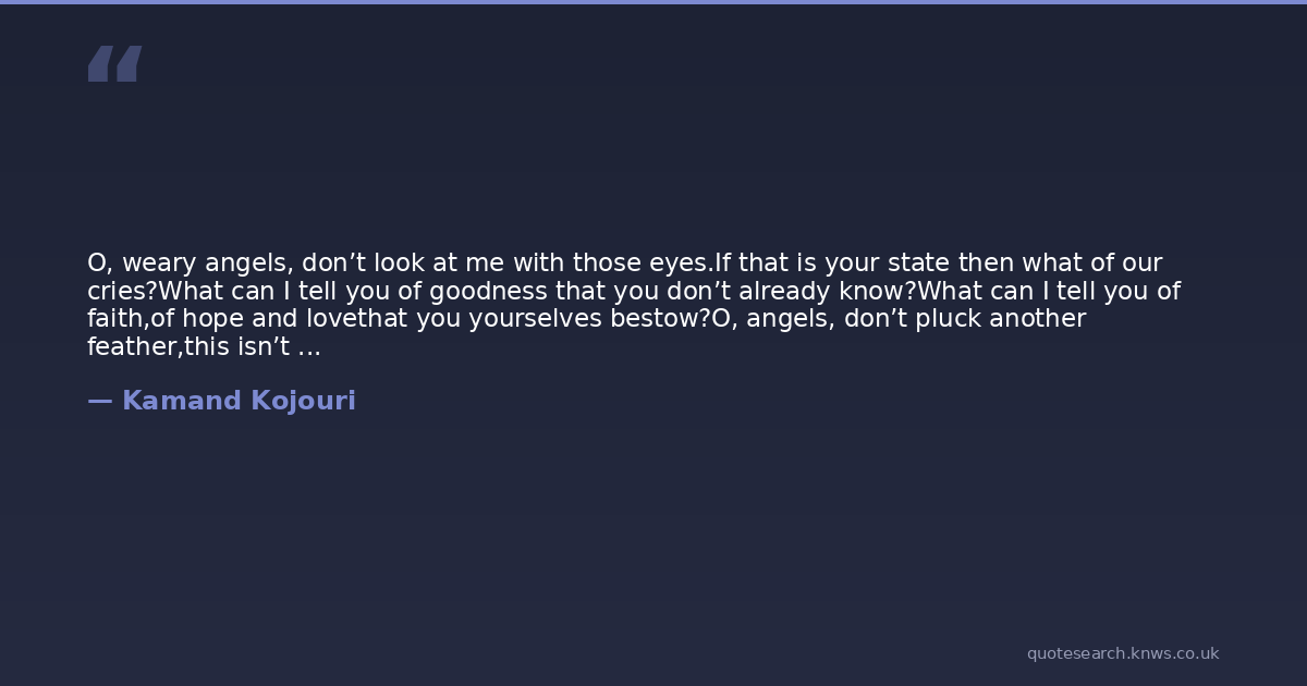O, weary angels, don’t look at me with those eyes.If that is your state then what of our cries?What can I tell you of goodness that you don’t already know?What can I tell you of faith,of hope and lovethat you yourselves bestow?O, angels, don’t pluck another feather,this isn’t the sky, it’s just the weather.Please, angels, try.We are one all together.Look up and listen, I’ll say it once and then put down my pen:We are sorry for our ignoranceand even though we are worldly,it might happen again.We are sorry for your wearinessand even though you aren’t worldly,we are no more than human.