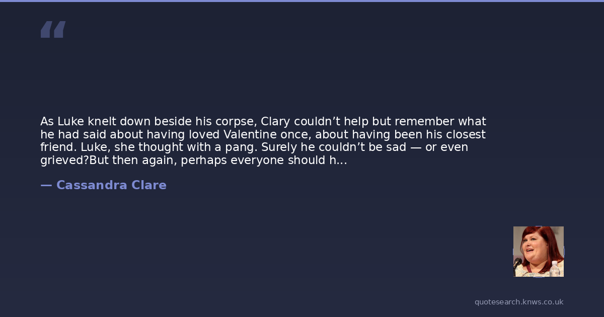 As Luke knelt down beside his corpse, Clary couldn’t help but remember what he had said about having loved Valentine once, about having been his closest friend. Luke, she thought with a pang. Surely he couldn’t be sad — or even grieved?But then again, perhaps everyone should have someone to grieve for them, and there was no one else to grieve for Valentine.