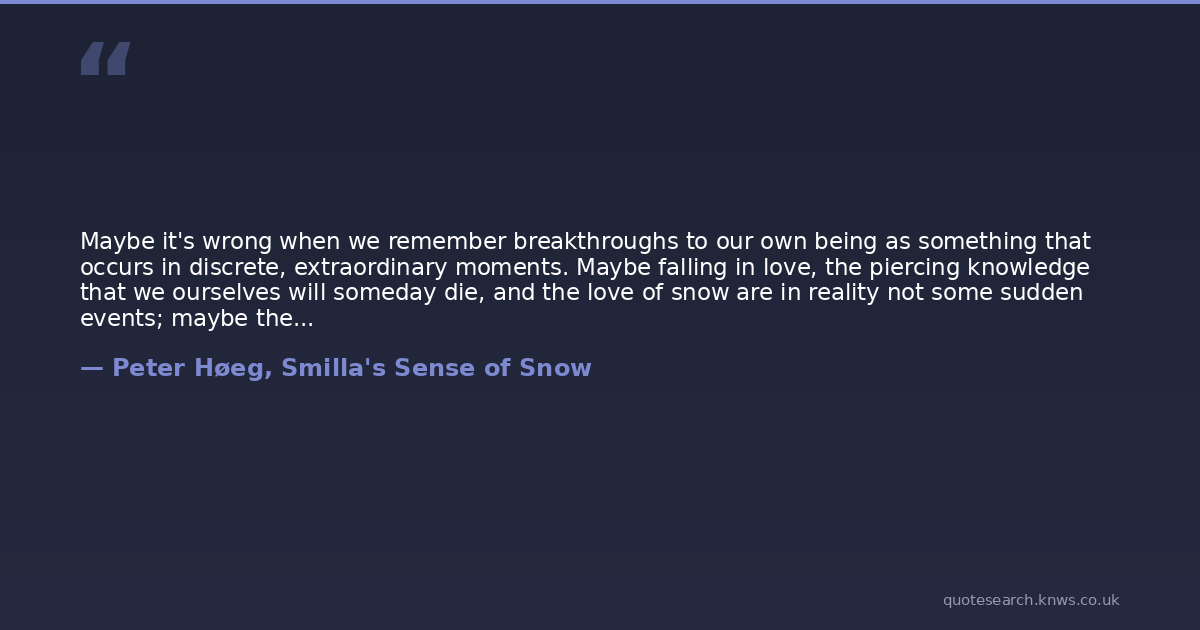 Maybe it's wrong when we remember breakthroughs to our own being as something that occurs in discrete, extraordinary moments. Maybe falling in love, the piercing knowledge that we ourselves will someday die, and the love of snow are in reality not some sudden events; maybe they were always present. Maybe they never completely vanish, either.