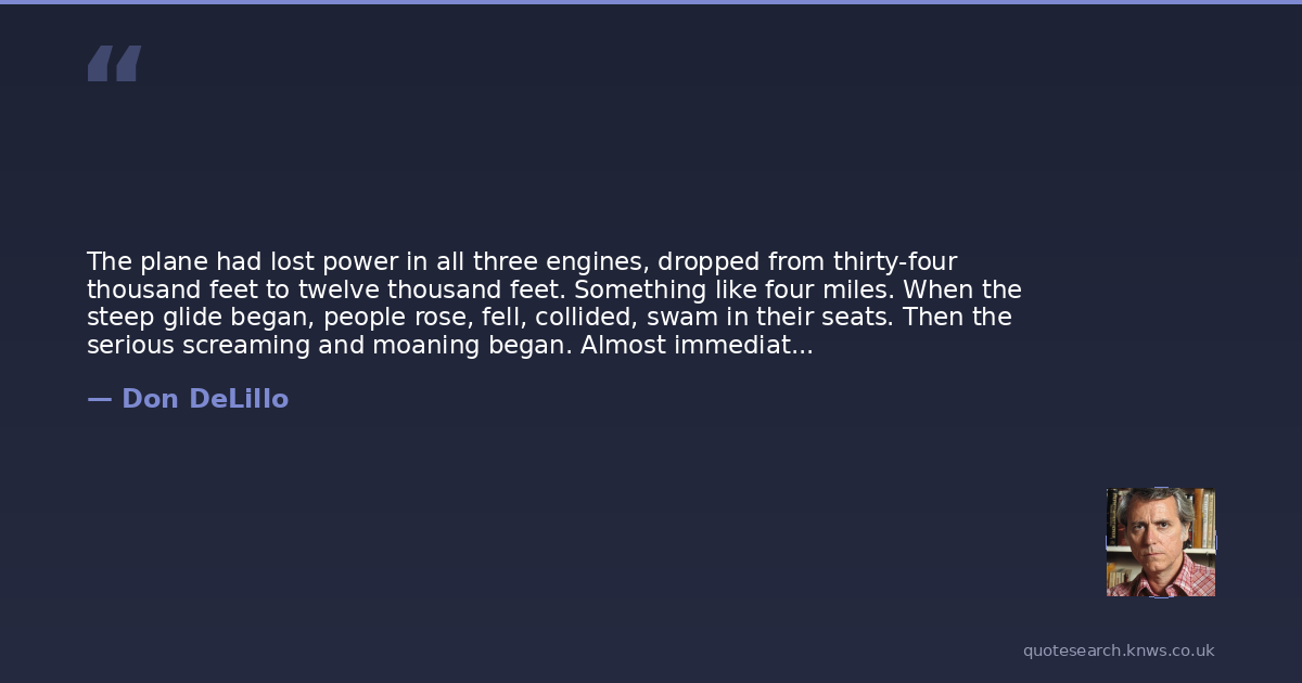 The plane had lost power in all three engines, dropped from thirty-four thousand feet to twelve thousand feet. Something like four miles. When the steep glide began, people rose, fell, collided, swam in their seats. Then the serious screaming and moaning began. Almost immediately a voice from the flight deck was heard on the intercom: "We're falling out of the sky! We're going down! We're a silver gleaming death machine!" This outburst struck the passengers as an all but total breakdown of authority, competence and command presence and it brought on a round of fresh and desperate wailing.