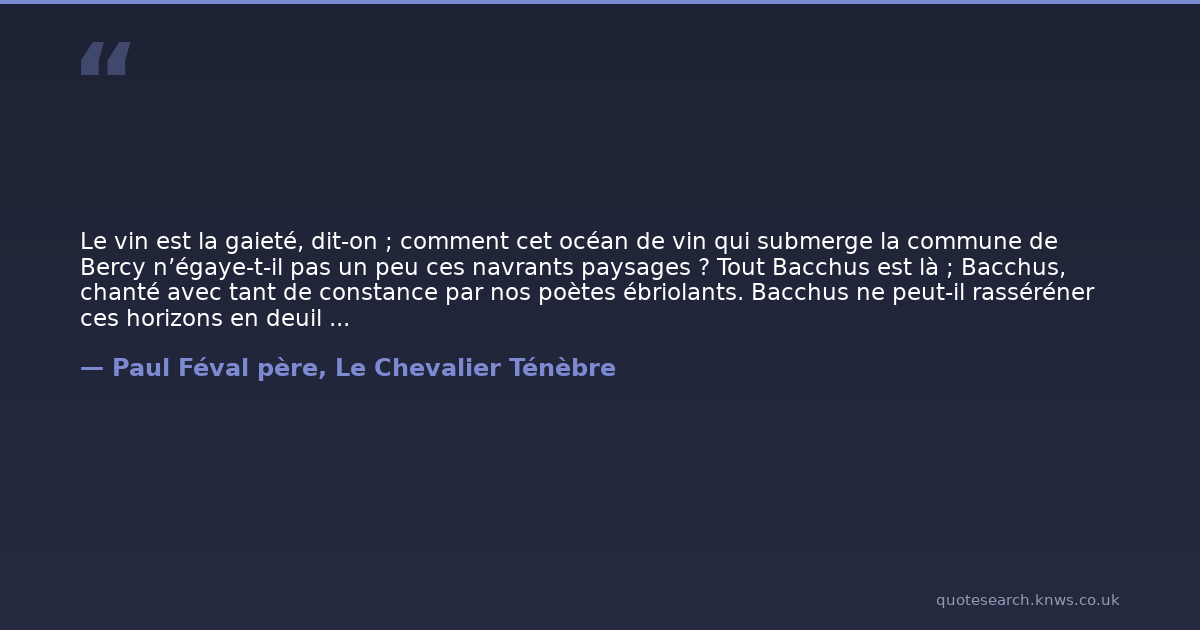 Le vin est la gaieté, dit-on ; comment cet océan de vin qui submerge la commune de Bercy n’égaye-t-il pas un peu ces navrants paysages ? Tout Bacchus est là ; Bacchus, chanté avec tant de constance par nos poètes ébriolants. Bacchus ne peut-il rasséréner ces horizons en deuil ? ou faut-il croire que Bacchus lui-même, ennemi de l’eau, est incommodé par le voisinage de la rivière ?
