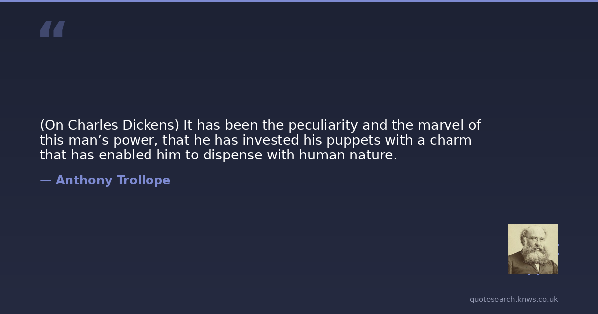 (On Charles Dickens) It has been the peculiarity and the marvel of this man’s power, that he has invested his puppets with a charm that has enabled him to dispense with human nature.