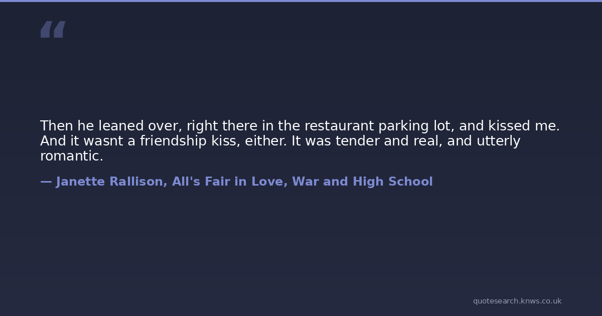 Then he leaned over, right there in the restaurant parking lot, and kissed me. And it wasnt a friendship kiss, either. It was tender and real, and utterly romantic.