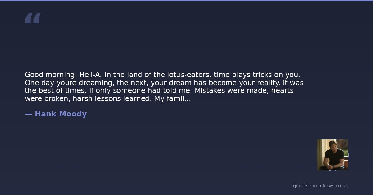 Good morning, Hell-A. In the land of the lotus-eaters, time plays tricks on you. One day youre dreaming, the next, your dream has become your reality. It was the best of times. If only someone had told me. Mistakes were made, hearts were broken, harsh lessons learned. My family goes on without me, while I drown in a sea of pointless pussy. I dont know how I got here. But here I am, rotting away in the warm California sun. There are things I need to figure out, for her sake, at least. The clock is ticking. The gap is widening. She wont always love me no matter what