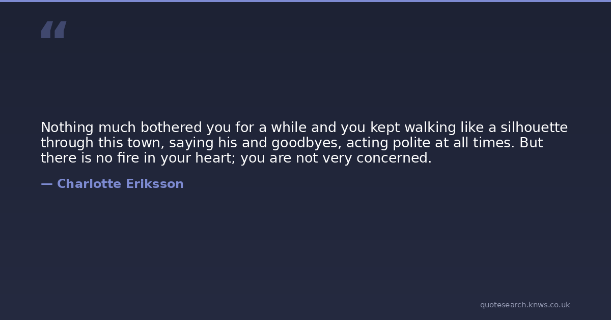 Nothing much bothered you for a while and you kept walking like a silhouette through this town, saying his and goodbyes, acting polite at all times. But there is no fire in your heart; you are not very concerned.