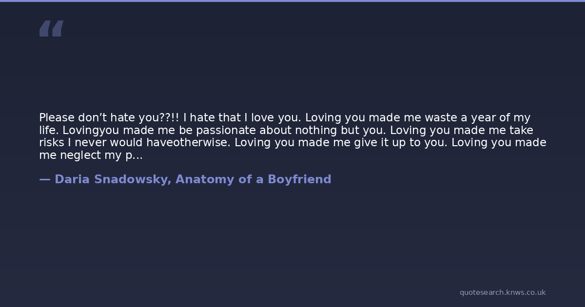 Please don’t hate you??!! I hate that I love you. Loving you made me waste a year of my life. Lovingyou made me be passionate about nothing but you. Loving you made me take risks I never would haveotherwise. Loving you made me give it up to you. Loving you made me neglect my parents and Amy.Loving you made me not care that my grandma just died. Loving you made me turn out bitter andhopeless like her. Loving you made me hate myself for being dumped by you. Loving you made medeluded, irrational, inconsiderate, and a liar. And because I love you, you’re always going to haunt me.
