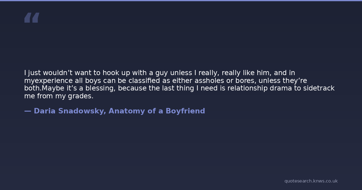 I just wouldn’t want to hook up with a guy unless I really, really like him, and in myexperience all boys can be classified as either assholes or bores, unless they’re both.Maybe it’s a blessing, because the last thing I need is relationship drama to sidetrack me from my grades.