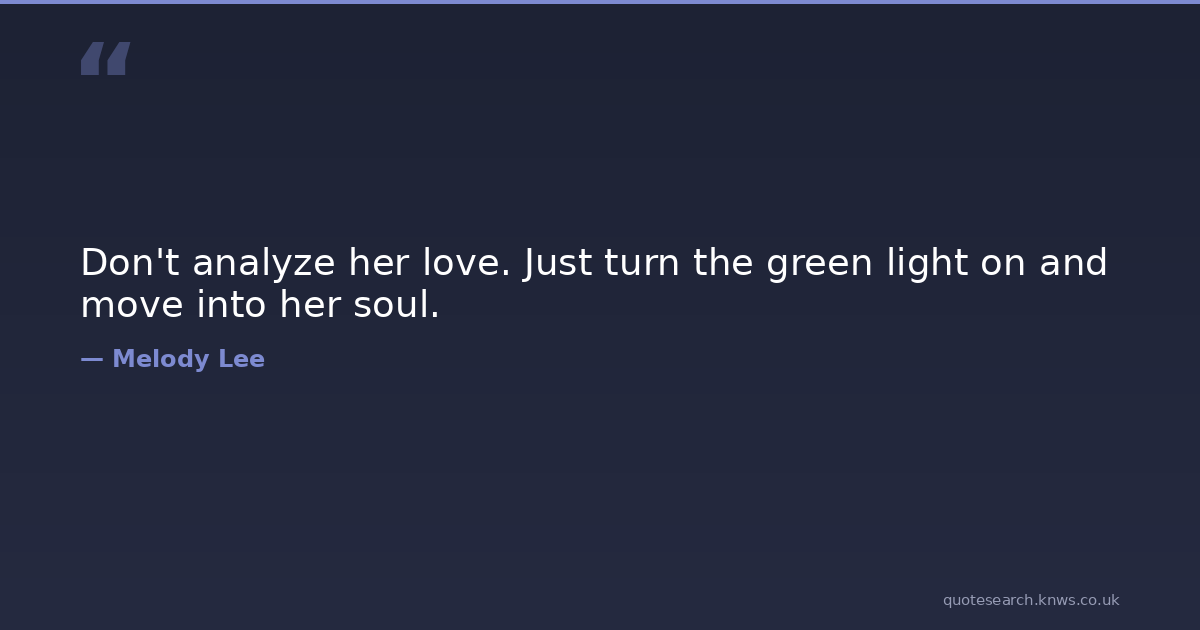 Don't analyze her love. Just turn the green light on and move into her soul. love poetry relationships soul Download Image Share on X Share on Facebook Copy Link