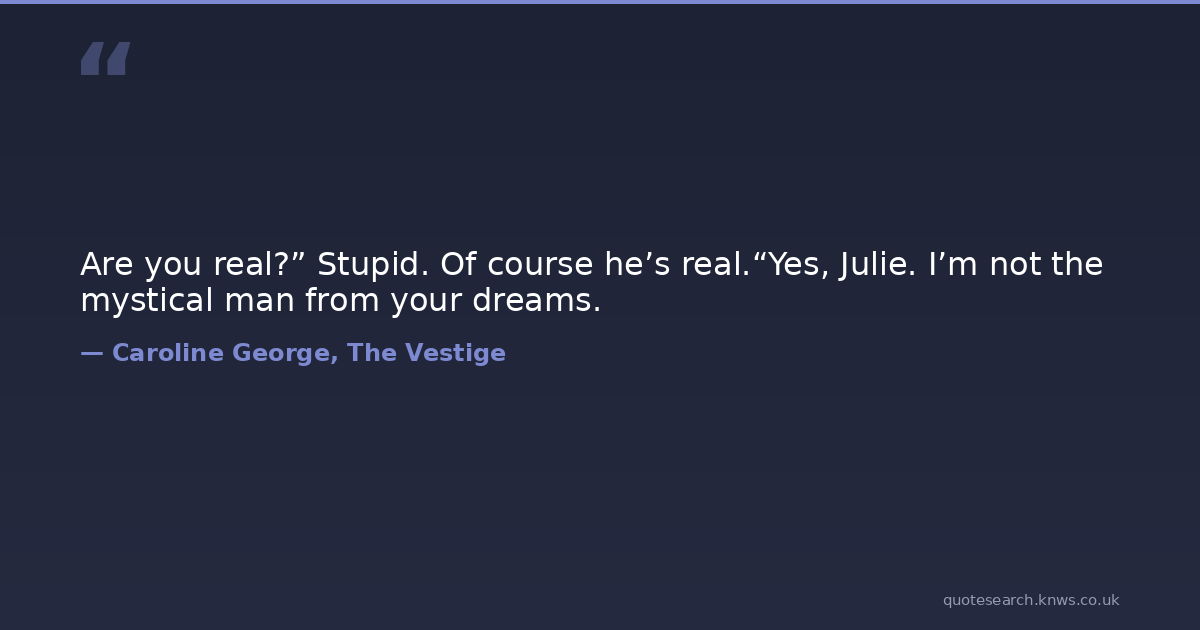 Are you real?” Stupid. Of course he’s real.“Yes, Julie. I’m not the mystical man from your dreams.