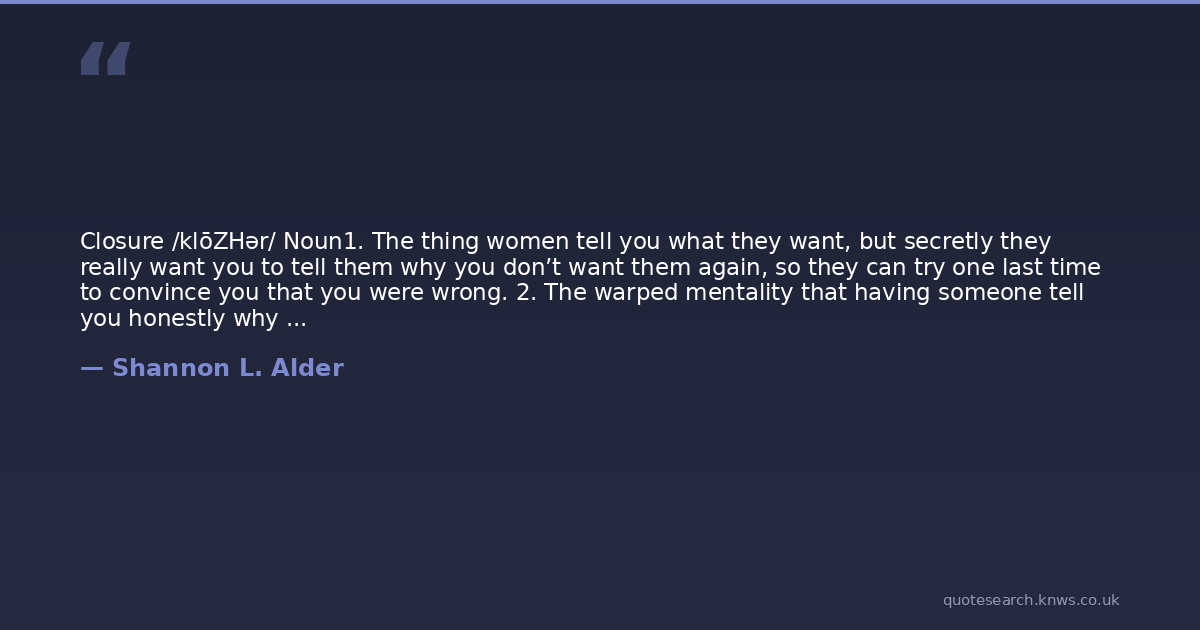 Closure /klōZHər/ Noun1. The thing women tell you what they want, but secretly they really want you to tell them why you don’t want them again, so they can try one last time to convince you that you were wrong. 2. The warped mentality that having someone tell you honestly why they don’t want you is going to somehow make you feel peace, so you can move on.3. The neat packaging of finishing conversations because you have been stewing over it insecurely about the length of what a stalker does. 4. The one thing women don’t give themselves because if they didn’t care about the jerk they wouldn’t still be hanging onto another conversation that tells them what they already know: He just isn’t that interested in you.5. The anal retentive art of perfecting every ending with meaning, rather than just excepting you went through something rather sucky and he doesn’t care.6. The act of closing something with someone, when in reality you should slam the door.