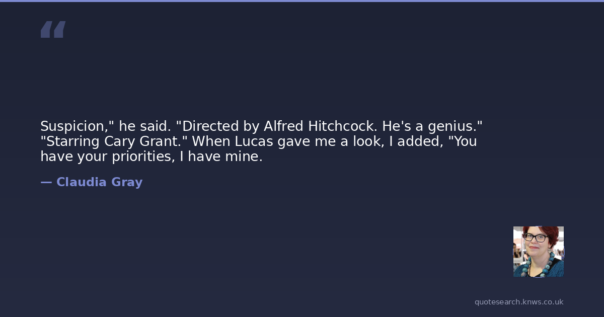 Suspicion," he said. "Directed by Alfred Hitchcock. He's a genius." "Starring Cary Grant." When Lucas gave me a look, I added, "You have your priorities, I have mine.