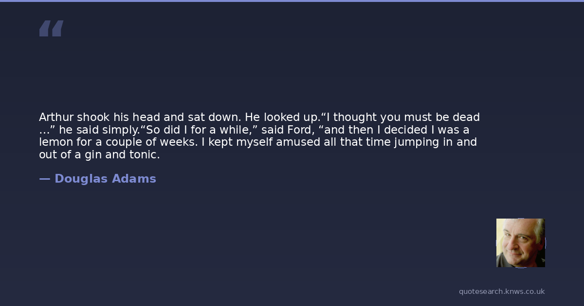 Arthur shook his head and sat down. He looked up.“I thought you must be dead …” he said simply.“So did I for a while,” said Ford, “and then I decided I was a lemon for a couple of weeks. I kept myself amused all that time jumping in and out of a gin and tonic.