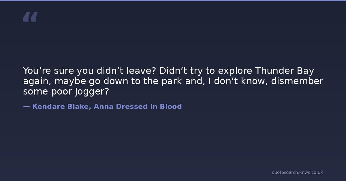 You’re sure you didn’t leave? Didn’t try to explore Thunder Bay again, maybe go down to the park and, I don’t know, dismember some poor jogger?