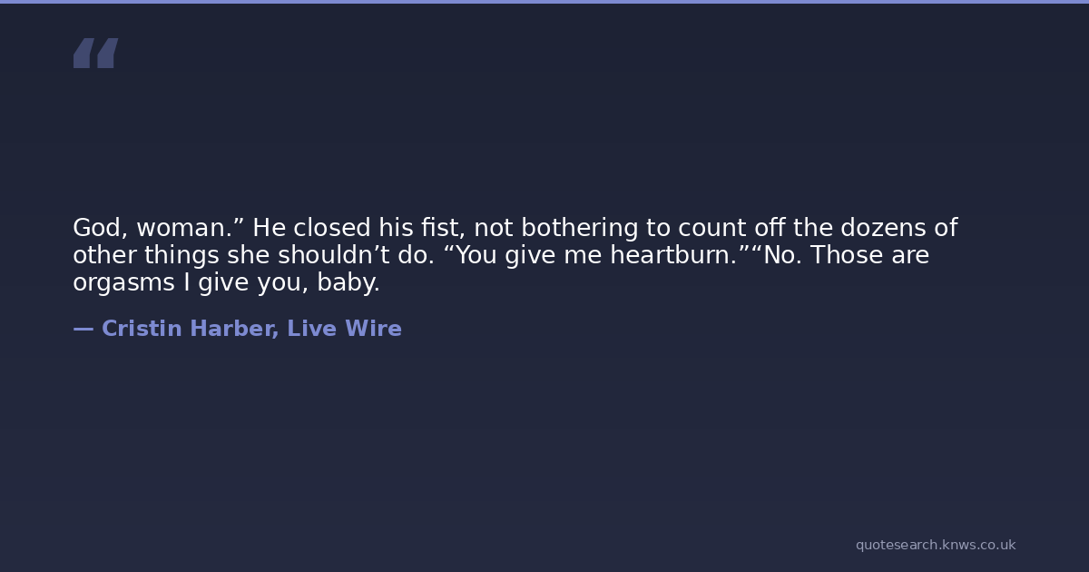 God, woman.” He closed his fist, not bothering to count off the dozens of other things she shouldn’t do. “You give me heartburn.”“No. Those are orgasms I give you, baby.