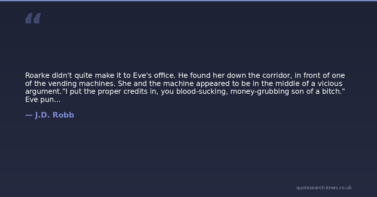 Roarke didn't quite make it to Eve's office. He found her down the corridor, in front of one of the vending machines. She and the machine appeared to be in the middle of a vicious argument."I put the proper credits in, you blood-sucking, money-grubbing son of a bitch." Eve punctuated this by slamming her fist where the machine's heart would be, if it had one.ANY ATTEMPT TO VANDALIZE, DEFACE, OR DAMAGE THIS UNIT IS A CRIMINAL OFFENSE.The machine spoke in a prissy, singsong voice Roarke was certain was sending his wife's blood pressure through the roof.THIS UNIT IS EQUIPPED WITH SCANEYE, AND HAS RECORDED YOUR BADGE NUMBER. DALLAS, LIEUTENANT EVE. PLEASE INSERT PROPER CREDIT, IN COIN OR CREDIT CODE, FOR YOUR SELECTION. AND REFRAIN FROM ATTEMPTING TO VANDALIZE, DEFACE, OR DAMAGE THIS UNIT."Okay, I'll stop attempting to vandalize, deface, or damage you, you electronic street thief. I'll just do it."She swung back her right foot, which Roarke had cause to know could deliver a paralyzing kick from a standing position. But before she could follow through he stepped up and nudged her off balance."Please, allow me, Lieutenant.""Don't put any more credits in that thieving bastard," she began, then hissed when Roarke did just that."Candy bar, I assume. Did you have any lunch?""Yeah, yeah, yeah. You know it's just going to keep stealing if people like you pander to it.""Eve, darling, it's a machine. It does not think.""Ever hear of artificial intelligence, ace?""Not in a vending machine that dispenses chocolate bars.
