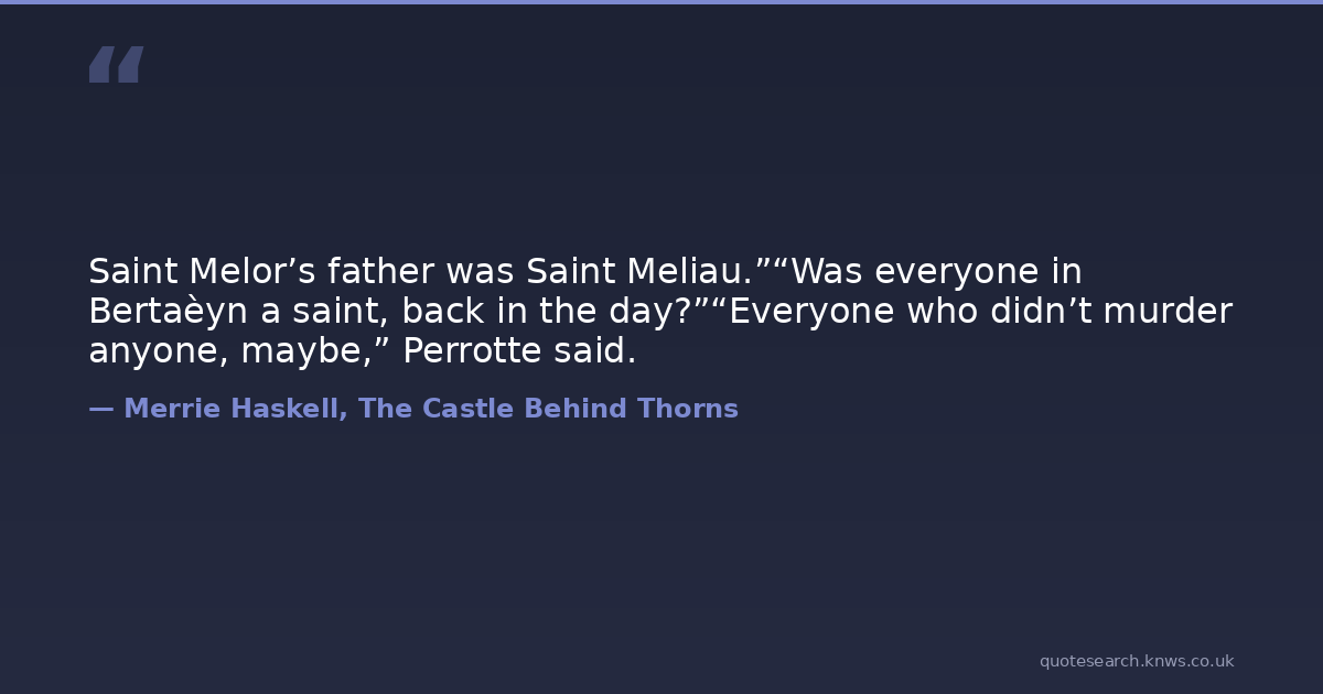 Saint Melor’s father was Saint Meliau.”“Was everyone in Bertaèyn a saint, back in the day?”“Everyone who didn’t murder anyone, maybe,” Perrotte said.