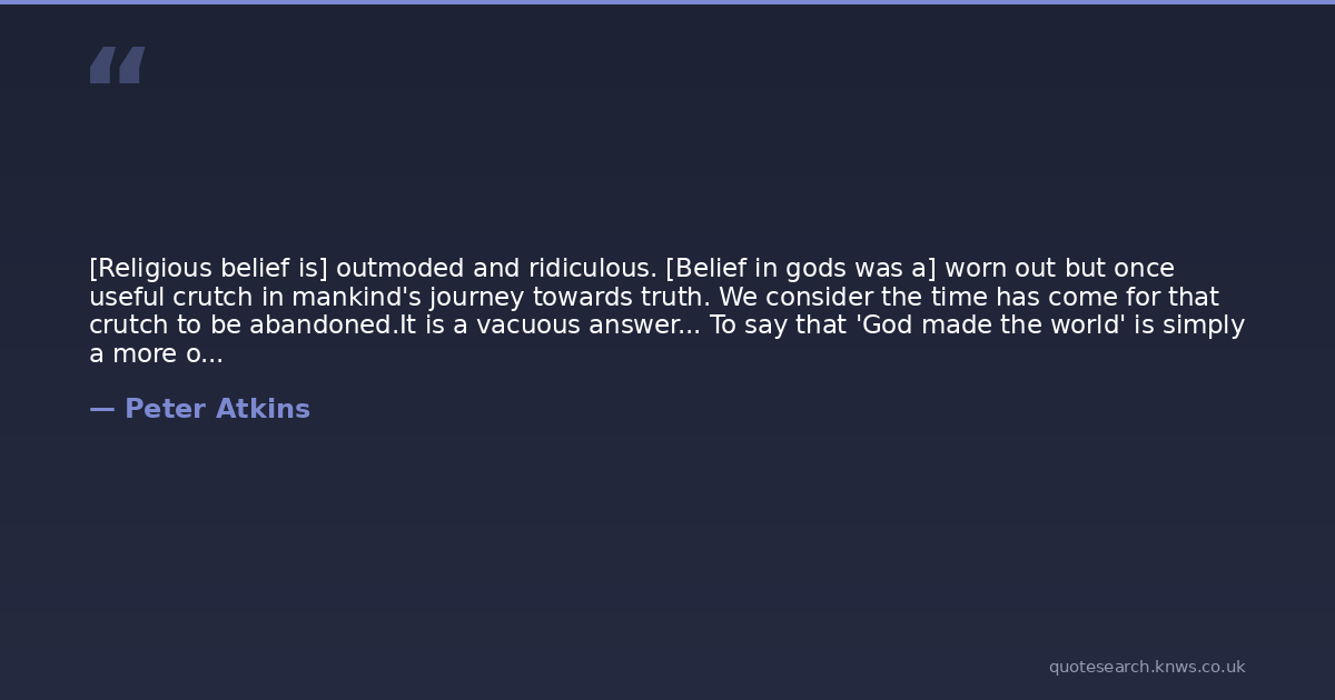 [Religious belief is] outmoded and ridiculous. [Belief in gods was a] worn out but once useful crutch in mankind's journey towards truth. We consider the time has come for that crutch to be abandoned.It is a vacuous answer... To say that 'God made the world' is simply a more or less sophisticated way of saying that we don't understand how the universe originated. A god, in so far as it is anything, is an admission of ignorance. thundered over the horizon and in a few decades of observation and thought . . . arrived at an answer.I regard teaching religion as purveying lies. I came here today to de-corrupt you all.