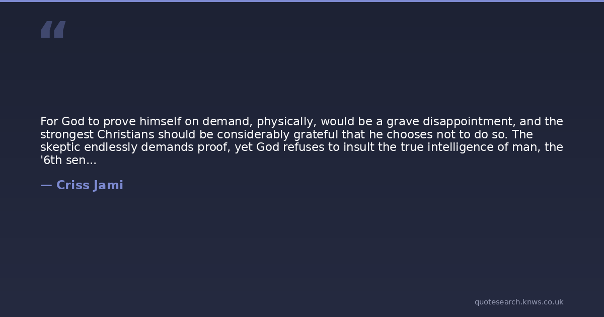 For God to prove himself on demand, physically, would be a grave disappointment, and the strongest Christians should be considerably grateful that he chooses not to do so. The skeptic endlessly demands proof, yet God refuses to insult the true intelligence of man, the '6th sense', the chief quality, the acumen which distinguishes man from the rest of creation, faith.