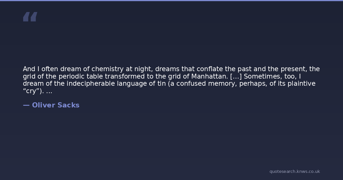 And I often dream of chemistry at night, dreams that conflate the past and the present, the grid of the periodic table transformed to the grid of Manhattan. […] Sometimes, too, I dream of the indecipherable language of tin (a confused memory, perhaps, of its plaintive “cry”). But my favorite dream is of going to the opera (I am Hafnium), sharing a box at the Met with the other heavy transition metals—my old and valued friends—Tantalum, Rhenium, Osmium, Iridium, Platinum, Gold, and Tungsten.