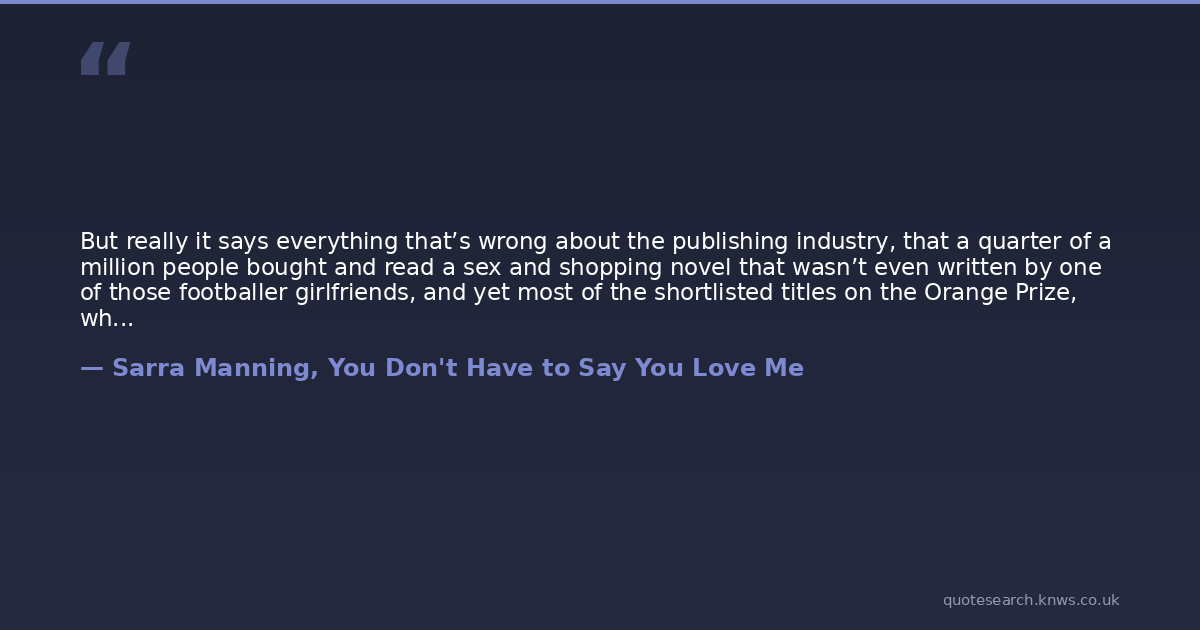 But really it says everything that’s wrong about the publishing industry, that a quarter of a million people bought and read a sex and shopping novel that wasn’t even written by one of those footballer girlfriends, and yet most of the shortlisted titles on the Orange Prize, which is an award for women writers, don’t even sell ten thousand copies. It’s just not right.