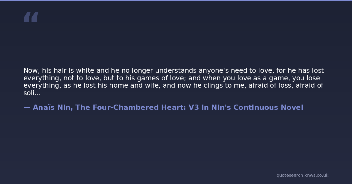 Now, his hair is white and he no longer understands anyone's need to love, for he has lost everything, not to love, but to his games of love; and when you love as a game, you lose everything, as he lost his home and wife, and now he clings to me, afraid of loss, afraid of solitude.