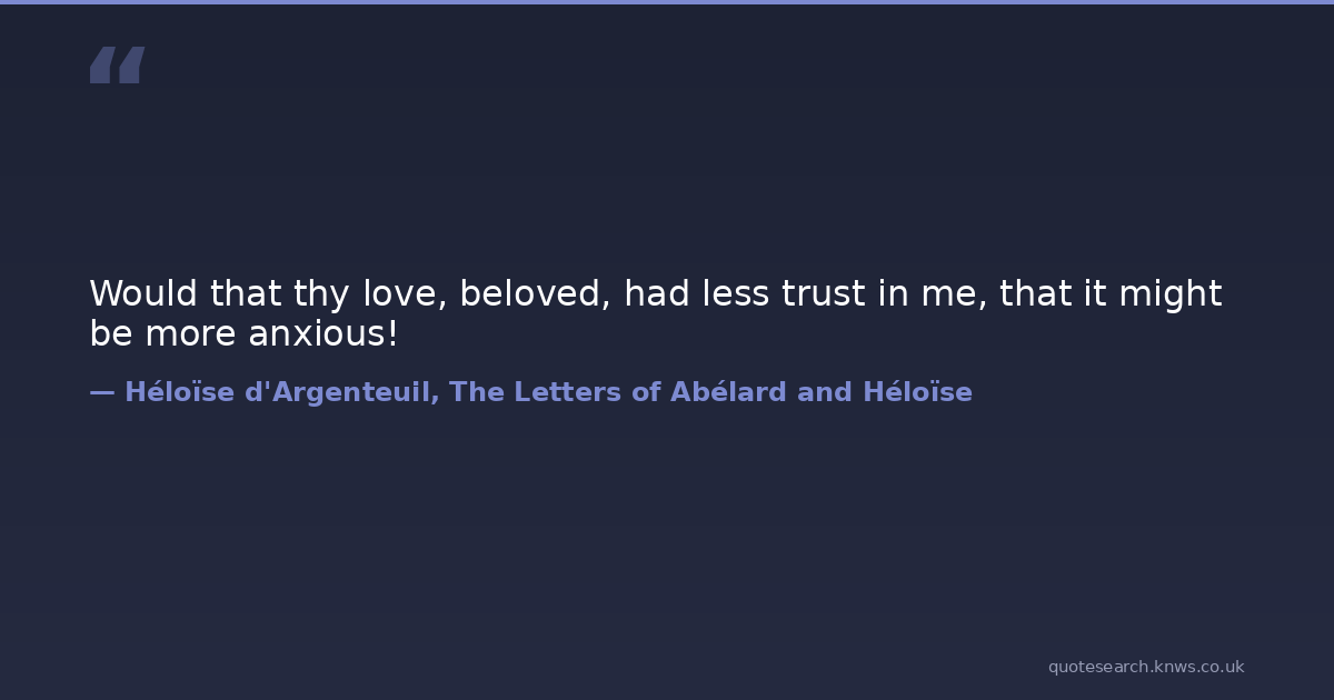 Would that thy love, beloved, had less trust in me, that it might be more anxious! absence desire fear jealousy longing love reunion separation trust urgency Download Image Share on X Share on Facebook Copy Link