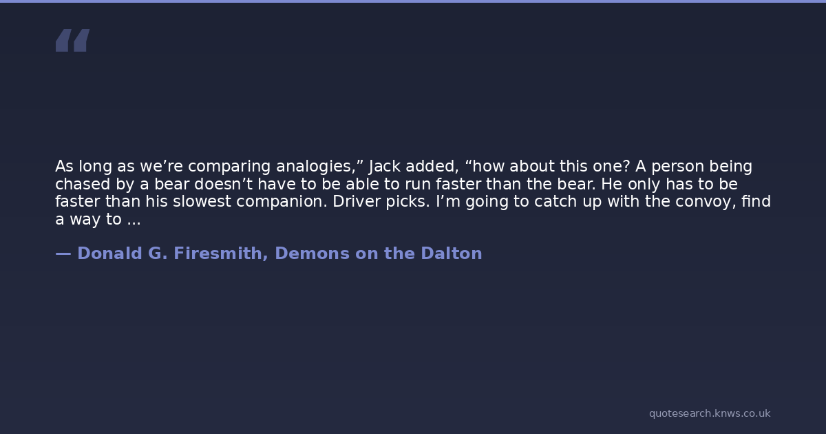 As long as we’re comparing analogies,” Jack added, “how about this one? A person being chased by a bear doesn’t have to be able to run faster than the bear. He only has to be faster than his slowest companion. Driver picks. I’m going to catch up with the convoy, find a way to pass several of the cars, and not be last in line.