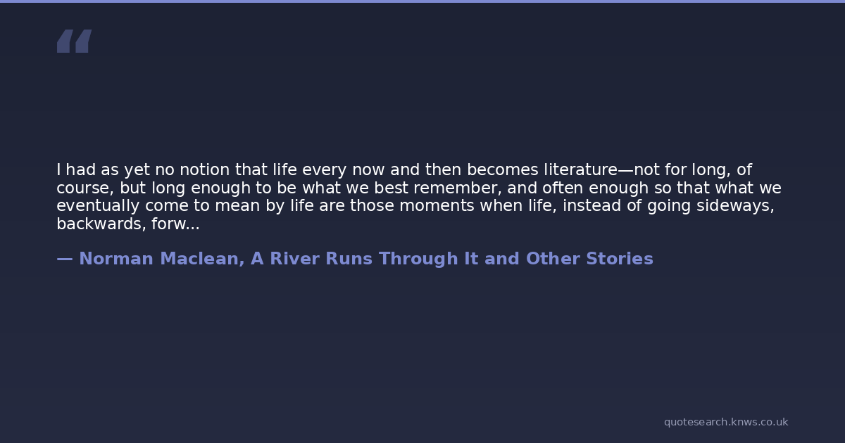 I had as yet no notion that life every now and then becomes literature—not for long, of course, but long enough to be what we best remember, and often enough so that what we eventually come to mean by life are those moments when life, instead of going sideways, backwards, forward, or nowhere at all, lines out straight, tense and inevitable, with a complication, climax, and, given some luck, a purgation, as if life had been made and not happened.