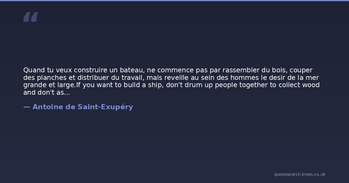 Quand tu veux construire un bateau, ne commence pas par rassembler du bois, couper des planches et distribuer du travail, mais reveille au sein des hommes le desir de la mer grande et large.If you want to build a ship, don't drum up people together to collect wood and don't assign them tasks and work, but rather teach them to long for the endless immensity of the sea.
