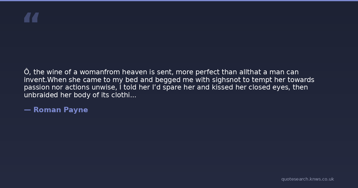 Ô, the wine of a womanfrom heaven is sent, more perfect than allthat a man can invent.When she came to my bed and begged me with sighsnot to tempt her towards passion nor actions unwise, I told her I’d spare her and kissed her closed eyes, then unbraided her body of its clothing disguise.While our bodies were nude bathed in candlelight fineI devoured her mouth, tender lips divine;and I drank through her thighs her feminine wine.Ô, the wine of a woman from heaven is sent,more perfect than all that a man can invent.