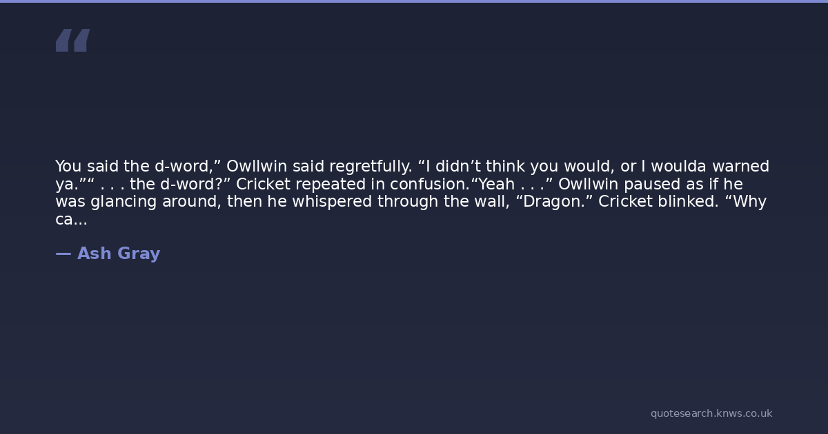 You said the d-word,” Owllwin said regretfully. “I didn’t think you would, or I woulda warned ya.”“ . . . the d-word?” Cricket repeated in confusion.“Yeah . . .” Owllwin paused as if he was glancing around, then he whispered through the wall, “Dragon.” Cricket blinked. “Why can’t I say that?