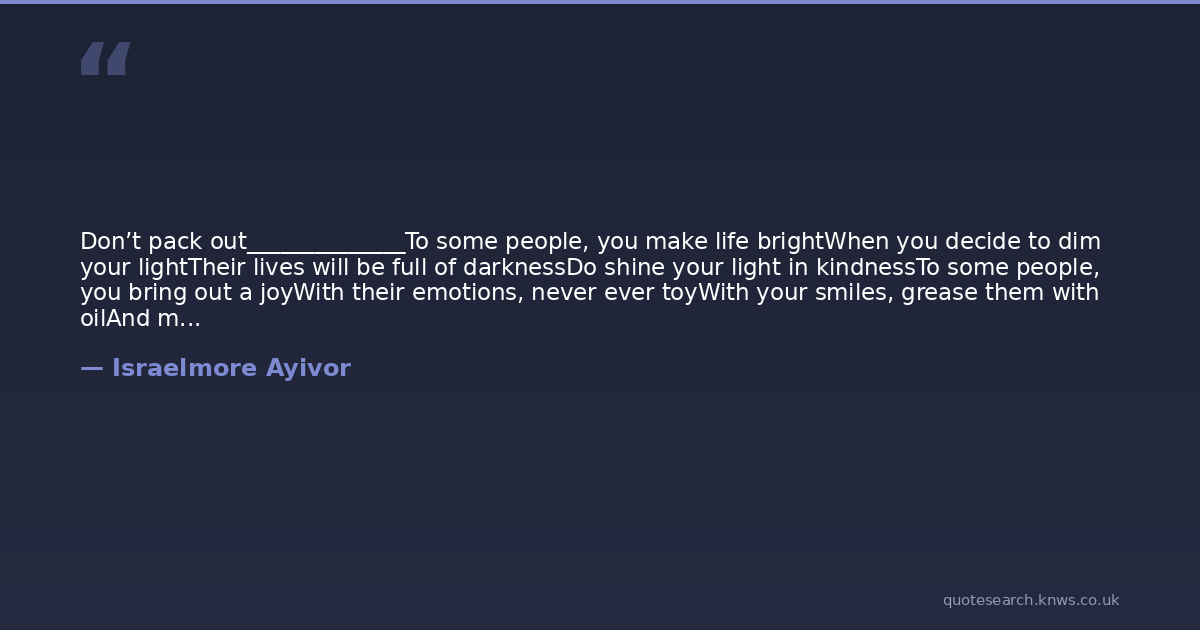 Don’t pack out______________To some people, you make life brightWhen you decide to dim your lightTheir lives will be full of darknessDo shine your light in kindnessTo some people, you bring out a joyWith their emotions, never ever toyWith your smiles, grease them with oilAnd make them glad when their lives boilTo other people, you are the warmthThat kills coldness and brings strengthDon’t do it; don’t pack outElse, they will have blackoutYou’re on earth to do two things hereWake up and do them now; this yearFirst, dare to grow and become betterSecond, help others to also become greaterNever in any of the four seasonsShould you neglect your gifts for any reasonsThe world needs you to make it a better placeDon’t pack out; run your race