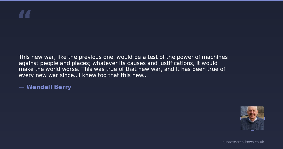 This new war, like the previous one, would be a test of the power of machines against people and places; whatever its causes and justifications, it would make the world worse. This was true of that new war, and it has been true of every new war since...I knew too that this new war was not even new but was only the old one come again. And what caused it? It was caused, I thought, by people failing to love one another, failing to love their enemies.